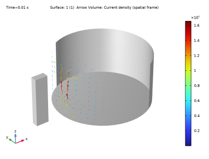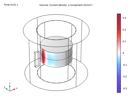این برنامه کاربردی COMSOL Multiphysics یک مشکل سه بعدی وابسته به زمان است. این یک مدل واقعی وابسته به زمان است که در آن حرکت روتور در شرایط مرزی بین هندسه استاتور و روتور محاسبه می شود. برای روتور جامد (غیر لایه ای) قسمت رسانا با استفاده از قانون آمپر مدل می شود: