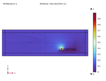شکل 6 نمودار پیش فرض پتانسیل الکتریکی مقیاس شده را در غیاب جسم آزمایشی هنگامی که یکی از پایانه های جانبی تغذیه می شود، نشان می دهد. پتانسیل در زمین صفر است و کمیت نمودار به صورت واحد در پایانه برانگیخته مقیاس بندی می شود. در دستورالعمل های گام به گام، طرح های مشابه دیگری برای پایانه های دیگر تولید می شود. در حالی که یک ترمینال تغذیه می شود، مقادیر پتانسیل شناور پایانه های غیر برانگیخته غیر صفر هستند. این مقادیر نشان دهنده معیارهای کوپلینگ های خازنی متقاطع مورب بین پایانه های مختلف است.