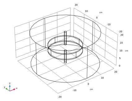 خازن مدل سازی شده از دو دیسک فلزی با سرنخ هایی تشکیل شده است که توسط یک دیسک شیشه ای کوارتز با گذردهی نسبی ε r = 4.2 و رسانایی الکتریکی کوچک σ = 10-14 S / m جدا شده اند ( شکل 1 ). این مدل شامل یک منطقه از هوای اطراف است ( εr = 1.0، σ = 5 ·10 -15 S / m) برای محاسبه فیلدهای حاشیه. خازن به یک مدار خارجی متشکل از یک منبع ولتاژ و یک مقاومت متصل است. در ابتدا خازن در حالت هم پتانسیل قرار دارد و هیچ اختلاف پتانسیلی بین صفحات وجود ندارد. ولتاژ در سراسر سیستم به طور لحظه ای روشن می شود و میدان های بالقوه و جریان از طریق دستگاه محاسبه می شود.