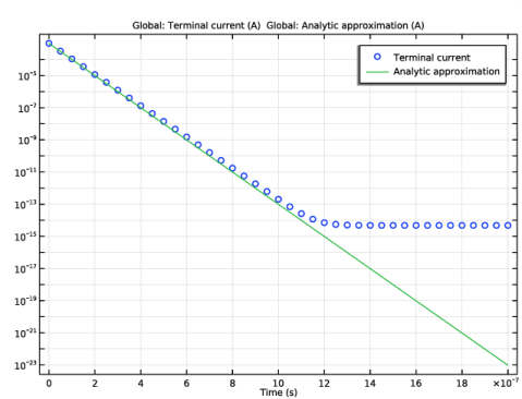 یک آنالیز الکترواستاتیک جداگانه می تواند برای محاسبه ظرفیت دستگاه با نتیجه C = 43.4 pF استفاده شود. مقاومت خارجی دارای مقاومت R = 1000 Ω است . راه حل تحلیلی برای جریان عبوری از یک مقاومت و خازن به صورت سری است