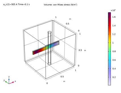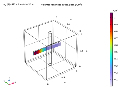 این برنامه را با دو رابط فیزیک حل کنید – رابط های میدان های مغناطیسی و مکانیک جامد. از یک مطالعه ثابت برای اولین رابط میدان های مغناطیسی و یک مطالعه اختلال دامنه فرکانس یا یک مطالعه وابسته به زمان برای رابط های میدان های مغناطیسی و مکانیک جامد استفاده کنید. جفت بین دو رابط به طور خودکار با استفاده از ویژگی جفت چندفیزیکی به نام جفت لورنتس در نظر گرفته می شود.