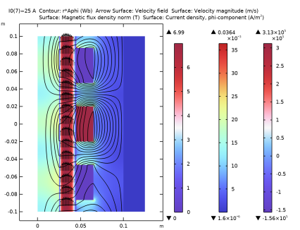شکل 2 چگالی شار مغناطیسی و همچنین هنجار سرعت سیال را در هندسه متقارن محوری دوبعدی با چرخش جزئی نشان میدهد، با تغییر شکل دامنه که بزرگی و جهت جریان سیال در ستون مایع را نشان میدهد.