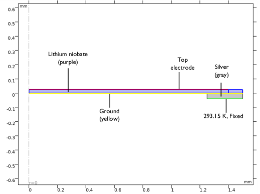 شکل 1: مقطعی از مدل متقارن محوری دوبعدی که مدلهای مواد و شرایط مرزی مورد استفاده را نشان میدهد. دیسک لیتیوم نیوبات (بنفش) و پد نقره ای (خاکستری) است. سطح پایین دیسک به زمین (زرد) متصل است در حالی که الکترود بالایی (قرمز) به یک مدار خارجی متصل است. یک محدودیت ثابت و T = 293.15 K به پایین پد نقره ای اعمال می شود.