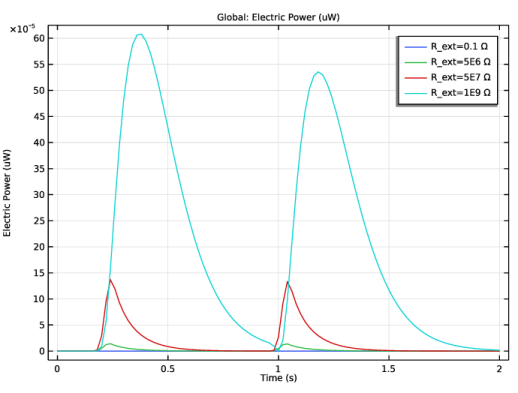 شکل 4: توان الکتریکی در مقابل زمان. اندازه گیری توان الکتریکی از طریق بار R1.