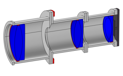 شکل 1: مروری بر هندسه آنالیز Lens STOP Petzval. لنزها به رنگ آبی نشان داده شده اند، پایه های لنز قرمز رنگ هستند و مجموعه آشکارساز خاکستری تیره است. یک مجموعه بشکه ساده این عناصر را به هم متصل می کند.