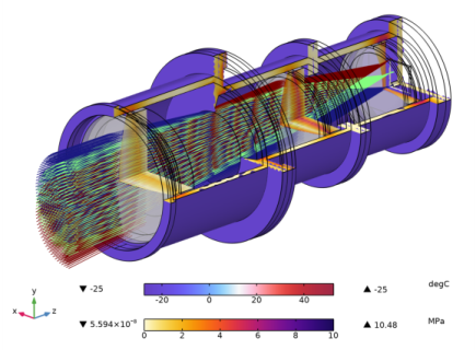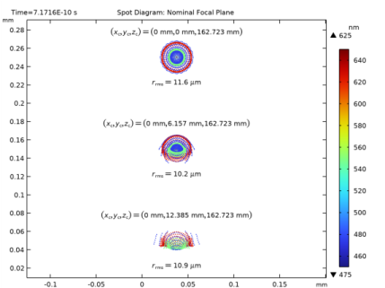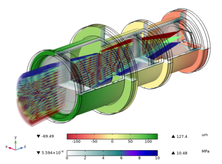 همانطور که در Petzval Lens STOP Analysis ، یک ردیابی پرتو با استفاده از سه طول موج ( 475  نانومتر، 550  نانومتر و 625  نانومتر) در سه زاویه میدان ( 0 درجه، 3.5 درجه و 7.0 درجه) انجام میشود. دما، جابجایی و میدان های تنش فون میزس حاصل در شکل 3 و شکل 4 نشان داده شده است .