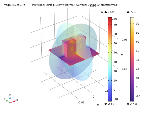 یک بلوک از دی الکتریک کوارتز، بالای آنتن شکاف قرار می گیرد. این بلوک به عنوان یک ساختار تشدید کننده و همچنین به عنوان یک عنصر تابشی عمل می کند. جهت الگوی تابش با الگوبرداری از لایه های فلزی اضافی بر روی بلوک بهبود می یابد. در این مثال، دو نوار در امتداد بالا و دو حلقه در امتداد هر وجه اضافه شده است. این لایهها بهعنوان صفحات PEC بینهایت نازک مدلسازی میشوند. ابعاد این عناصر به گونه ای انتخاب می شوند که در فرکانس کاری 2.9 گیگاهرتز تشدید شوند. این عناصر تغذیه نشده اضافی برای افزایش جهت ساختار آنتن عمل می کنند.