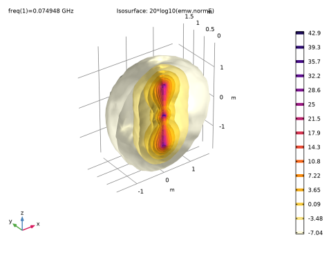نمودار قطبی در شکل 3 از الگوی میدان دور در صفحه xy ، الگوی تابش همسانگرد مورد انتظار را نشان می دهد. تجسم سه بعدی شدت میدان دور در شکل 4 الگوی چنبره شکل مورد انتظار را نشان می دهد.