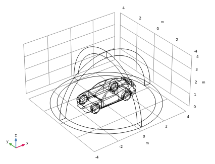 مدلسازی با وارد کردن هندسهای آغاز میشود که بدنه خودرو، دسته کابل و آنتن FM شیشه جلو را توصیف میکند ( شکل 1 ). اشیاء داخلی داخل خودرو شامل نمی شود. تمام قطعات فلزی به عنوان رسانای الکتریکی کامل (PEC) مدلسازی میشوند که شامل بدنه خودرو، یک آنتن چاپ شده روی شیشه جلوی عقب، رینگهای لاستیک، یک دسته کابل متصل به محفظههای قطعات الکترونیکی و صفحه زمین است. حوزههای تایر بهعنوان یک محیط با تلفات، با استفاده از یک رابطه سازنده مماس تلفات مدلسازی میشوند. به جز هواپیمای زمینی، خودرو توسط یک دامنه هوایی احاطه شده است که توسط لایه های کاملاً منطبق (PML) محصور شده است. شیشه جلو با ضخامت 1 سانتی متر در محدوده فرکانس FM شفاف و بسیار نازک در نظر گرفته می شود. با استفاده از شرط مرزی Transition پیکربندی شده است.