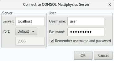 سپس از شما یک نام کاربری و رمز عبور خواسته می شود. شما می توانید از هر نام کاربری و رمز عبور دلخواه خود استفاده کنید، این نام فقط برای اتصال یک سرویس گیرنده مولتیفیزیک COMSOL با یک سرور مولتیفیزیک کامسول استفاده می شود.