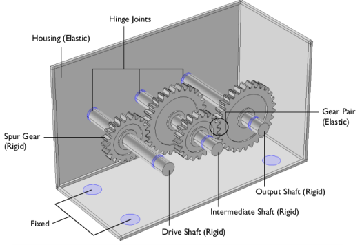 چرخ دنده های خار برای مدل سازی قطار دنده استفاده می شود. چرخ دنده ها روی شفت های سفت و سخت نصب می شوند و شفت ها توسط محفظه الاستیک در هر دو انتها پشتیبانی می شوند. مش دنده الاستیک با سفتی متفاوت فرض می شود که منبع ارتعاش پایدار است. یک تحلیل گذرا برای محاسبه دینامیک چرخ دنده ها و همچنین ارتعاشات در محفظه انجام می شود.