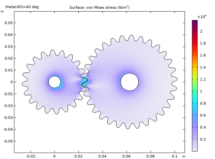شکل 5: توزیع تنش فون میزس در جفت چرخ دنده در یک موقعیت خاص در چرخه مش. در این موقعیت نسبت تماس 2 است.