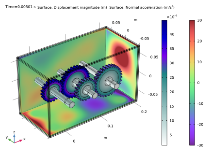 این مدل ارتعاشات یک قطار دنده مرکب را شبیه سازی می کند. این با استفاده از عملکرد چرخ دنده در رابط Multibody Dynamics در COMSOL Multiphysics ساخته شده است.