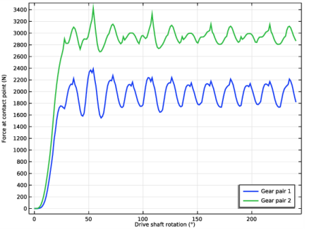 جابجایی در دنده ها و شتاب طبیعی در محفظه در شکل 7 نشان داده شده است . تغییر نیروی تماس در هر دو جفت دنده در شکل 8 نشان داده شده است . مشاهده می شود که نیروی تماس به طور مداوم با چرخش دنده تغییر می کند. این تغییرات در یک چرخه مش دوره ای است. همچنین می توان مشاهده کرد که مقدار میانگین نیروی تماس در جفت دنده دوم بیشتر از جفت دنده اول است. این به این دلیل است که سرعت شفت میانی بیشتر از سرعت شفت خروجی است. نسبت مقادیر میانگین نیروهای تماس تقریباً با نسبت دنده یکسان است.