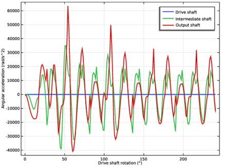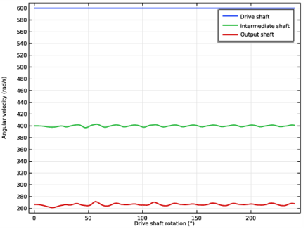 شکل 9 و شکل 10 تغییر سرعت زاویه ای و شتاب محور محرک، شفت میانی و شفت خروجی را نشان می دهد. نسبت مقادیر میانگین سرعت زاویه ای شفت های مختلف با نسبت دنده یکسان است. سرعت زاویه ای شفت محرک همانطور که تجویز می شود ثابت است، با این حال سرعت زاویه ای شافت میانی و خروجی همچنان در مورد مقادیر میانگین مربوطه نوسان می کند. منبع نوسانات پایدار، سفتی متغیر مش دنده است. همچنین می توان به این نکته اشاره کرد که نوسانات سرعت شفت خروجی بیشتر از شفت میانی است.