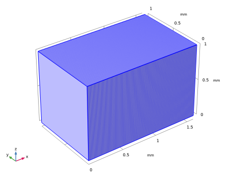 اگرچه هندسه مدل در این مثال سه بعدی است، مدل اساساً 1D-3V است، به این معنی که تنها یک جزء از موقعیت ذره و هر سه مولفه سرعت ذره مرتبط هستند. چگالی فضایی ذرات و پتانسیل الکتریکی در جهات y و z کاملاً یکنواخت فرض می شود . همانطور که در شکل 2 نشان داده شده است ، برای اعمال این یکنواختی بدون وارد کردن اجزای y – و z – جعلی میدان الکتریکی، یک شبکه بسیار ساختار یافته با تنها یک عنصر در این جهات و تعداد زیادی عنصر بسیار نازک در جهت x استفاده شد. .