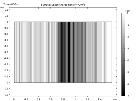 روش دیگر برای مشاهده رفتار پس از اشباع، ترسیم و متحرک سازی توزیع چگالی بار فضایی در نمودار Slice از طریق هندسه مدل است. شکل 4 یکی از این نمودارها را در یک زمان پس از رسیدن به اشباع نشان می دهد. نوار تاریک نوار اصلی است که حاوی بیشتر الکترون های ثانویه تازه آزاد شده است. نوار سبک تر شامل برخی از ذرات ثانویه اخیراً آزاد شده است که به دلیل اثرات بار فضایی نوار اصلی را هدایت یا دنبال می کنند، و همچنین الکترون هایی که در آخرین چرخه RF کاملاً به دیواره مقابل نرسیده اند. چگالی بار فضایی از توابع شکل ثابت در هر عنصر مش استفاده می کند، بنابراین تغییرات شدید رنگ فقط نشان می دهد که یک عنصر به کجا ختم می شود و عنصر بعدی شروع می شود. برای صافتر جلوه دادن طرح، مش را در داخل آن اصلاح کنیدجهت x (که همچنین ممکن است به تعداد بیشتری از ذرات مدل برای همگرایی آماری نیاز داشته باشد) یا صاف کردن راه حل در طول پردازش نتایج.