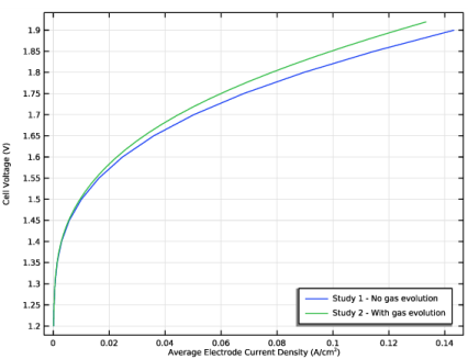 شکل 2 منحنی های پلاریزاسیون را برای دو مورد شامل و عدم احتساب تکامل گاز در مدل نشان می دهد. از جمله تکامل گاز در مدل توزیع فعلی نشان دهنده یک اثر قطبی کوچک، اما قابل توجه به دلیل حباب های تولید شده است.