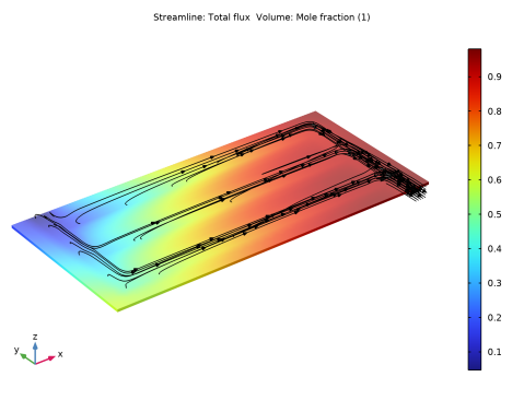 شکل 5 کسر مولی هیدروژن در مخلوط گاز و خطوط جریان هیدروژن مربوطه را نشان می دهد. کسر مولی در ورودی نزدیک به صفر و در خروجی تقریباً 100٪ است.