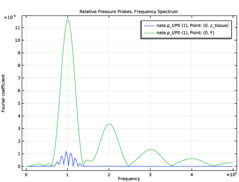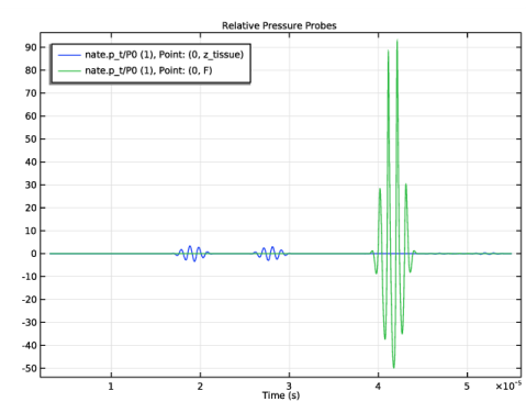 عدسی کروی با شعاع r و دیافراگم a سیگنالی را منتشر می کند که در نقطه کانونی F واقع در فانتوم بافت متمرکز شده است. سیگنال یک انفجار تون پنج سیکلی با دامنه P 0 = 0.1 MPa و فرکانس مرکزی f 0 = 1 مگاهرتز است که در شکل 2 نشان داده شده است . دامنه سیگنال در محل منبع به اندازه کافی برای تولید هارمونیک های مرتبه بالاتر است، اما به اندازه کافی برای ایجاد شوک بالا نیست، و بنابراین در این مدل به تکنیک های خاص ضربه گیری نیاز نیست.