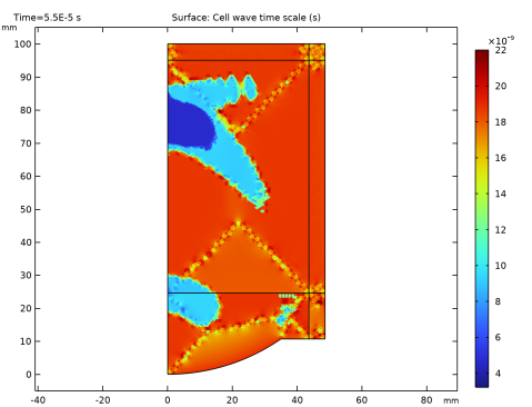 فیزیک آکوستیک فشار غیرخطی، فیزیک صریح زمان بر اساس dG-FEM است و از طرحهای ادغام زمانی صریح استفاده میکند. مرحله زمانی حل کننده از شرایط CFL پیروی می کند تا از پایداری روش یکپارچه سازی زمانی اطمینان حاصل شود. یعنی Δ t ≤ h min / c max ( p ) , که h min حداقل اندازه عنصر مش و c max ( p ) است.حداکثر سرعت انتشار موج است. در حالت غیر خطی سرعت صوت به فشار آکوستیک بستگی دارد. در این مدل، مش از انتشار غیرخطی سیگنال تبعیت می کند و بنابراین دارای عناصر کوچکتر در اطراف جبهه های تیز و عناصر بزرگتر از آن است. ارزش انتخاب روش گام به گام به Adam-Bashforth 3 (محلی) و فعال کردن گزینه Update time levels موجود در بخش عمومی از حل کننده زمان صریح را دارد. شکل 7 مقادیر مقیاس زمانی موج سلولی elte.wtc را نشان می دهدمتغیر، که گام زمانی متناسب با آن است. مقادیر کوچکتر برای عناصر شبکه کوچکتر در مجاورت سیگنال یافت می شود، در حالی که مقادیر بزرگتر در بقیه حوزه محاسباتی استفاده می شود.