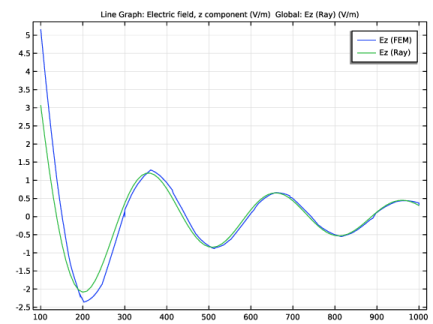 در رابط اپتیک هندسی، یک پرتو در جهت (1،0،1) منتشر می شود. برای تأیید اینکه دامنه و فاز میدان الکتریکی در امتداد این پرتو هر دو صحیح هستند، یک مجموعه داده Cut Line در اولین هندسه سه بعدی وارد می شود و میدان الکتریکی در امتداد این خط رسم می شود. دو نمودار به طور مستقیم در شکل 3 مقایسه شده اند . منطقی است که دو نمودار در مبدأ به طور قابل توجهی متفاوت باشند. میدان دور یک راه حل مجانبی است و چندان نزدیک به منبع تابش اعمال نمی شود. توافق بین دو منحنی با انتشار پرتو به دور از آنتن دوقطبی بهتر می شود.