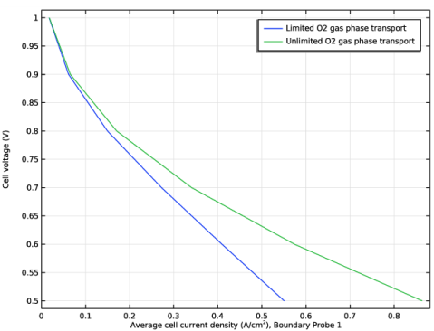 شکل 3 نمودار پلاریزاسیون را برای دو سناریو مورد بررسی نشان می دهد: انتقال فاز گاز O 2 محدود و نامحدود . مشاهده میشود که میانگین تراکم جریان سلولی بالاتر برای سناریوی انتقال فاز گاز O2 نامحدود (یعنی زمانی که محدودیتهای انتقال جرم و تکانه وجود ندارد) به دست میآید .