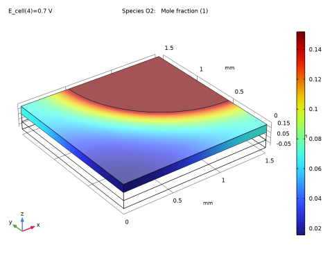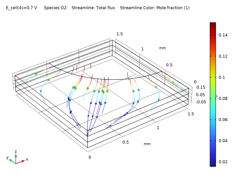 در بخش اول دستورالعمل مدل زیر، توزیع جریان ثانویه (نه وابسته به غلظت) مدل شده است. در بخش دوم، انتقال جرم و مومنتوم به ترتیب با استفاده از انتشار ماکسول-استفان و قانون دارسی در مخلوط فاز گازی O2 (دامنه کاتد) گنجانده شده است. در هر دو بخش آموزش، مدل برای محدوده ای از مقادیر پتانسیل سلولی (0.5 ولت تا 1 ولت در مراحل 0.1 ولت) با استفاده از یک جارو کمکی در حلگر ثابت حل می شود.