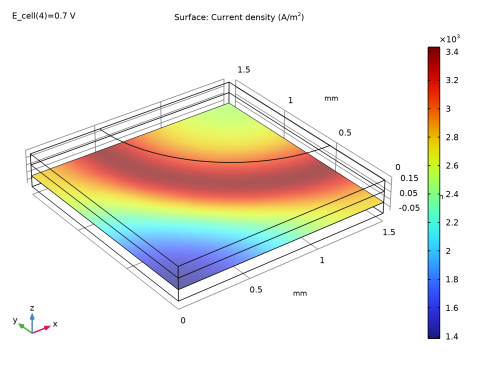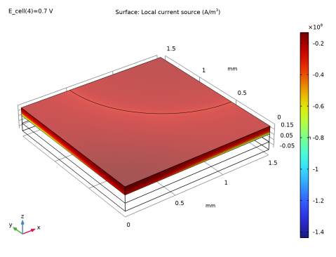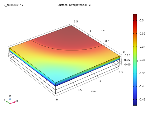 . همچنین، بیان چگالی جریان محلی در آند در یک منطقه خاص 10 9 m 2 / m 3 ضرب می شود تا یک منبع جریان حجمی در حوزه الکترود ایجاد شود. مازاد پتانسیل در آند به صورت تعریف می شود