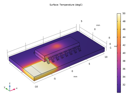 این شبیهسازی وضعیت حرارتی یک تراشه سیلیکونی را در یک بسته نصب شده بر روی یک برد مدار نزدیک به یک تنظیمکننده ولتاژ داغ بررسی میکند. تراشه در معرض گرمای تنظیم کننده و گرمای تولید شده داخلی قرار می گیرد.