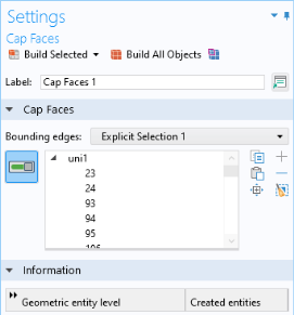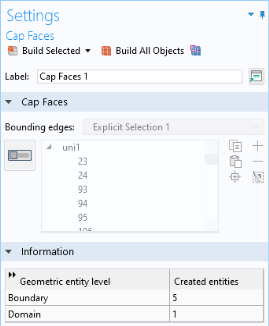 در پنجره تنظیمات برای Cap Faces، از لیست Bounding Edges، Explicit Selection 1 را انتخاب کنید، که همچنان لبه های صحیح را شامل می شود، زیرا عملیات هندسه ارتباطی هستند.