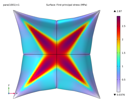 شکل 6: اولین تنش اصلی در مرکز کیسه هوا در هنگام باد کردن.