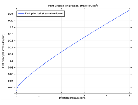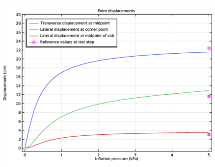 شکل 5 جابجایی سه نقطه مواد مختلف را به عنوان تابعی از فشار تورم نشان می دهد. این جابجایی ها با نتایج ارائه شده در Ref. 1 . در فشار نهایی، مقادیر به خوبی با مقادیر مرجع مطابقت دارند. شکل 6 تغییر در اولین تنش اصلی (کششی) در نقطه میانی کیسه هوا را با فشار باد نشان می دهد.