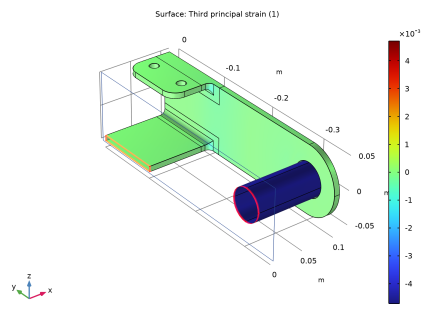 شکل 3 سومین کرنش اصلی را به منظور تجسم کرنش کل در ساختار نشان می دهد. از آنجایی که پین در مقایسه با براکت سفت است، کل کرنش در پین تقریباً با کرنش اولیه ارائه شده در مثال مشابه است.
