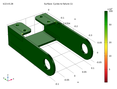 در شکل 4 یک عمر محدود نزدیک به سوراخ هایی که براکت را محکم می کنند، پیش بینی شده است. این نتایج به شدت به شرایط مرزی که در آنجا اعمال می شود وابسته است. در این مدل از پایه های فنری برای بستن براکت استفاده شد، اما محدودیت را می توان با استفاده از یک اتصال ثابت با تجزیه و تحلیل تماس کامل نیز اعمال کرد. این امر میدان تنش را در مجاورت سوراخ ها تغییر می دهد و منجر به طول عمر خستگی متفاوت می شود.
