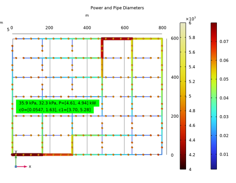 شکل 2 قطر لوله بهینه شده را همراه با قدرت گرمایش برای هر مصرف کننده نشان می دهد. طراحی شبکه همانطور که انتظار می رود به لوله های کوچکتر و کوچکتر منشعب می شود. در این مورد، وضعیتی را در نظر بگیرید که تقریباً در همه جا مصرف کننده وجود دارد و این کاهش لوله های یورو را دشوار می کند .