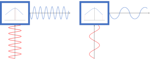 شکل 1: نیروی لورنتس بر روی سیم پیچ صدا (منحنی های آبی در امتداد محور افقی) هنگامی که یک جریان فرکانس بالا (چپ) و فرکانس پایین (راست) از سیم پیچ صدا عبور می کند (منحنی های قرمز در امتداد محور عمودی). در فرکانس بالا، جابجایی سیم پیچ صدا کوچک است، به این معنی که فاکتور BL در طول حرکت تقریبا ثابت می ماند و اعوجاج ناچیزی ایجاد می کند. در فرکانس های پایین، جابجایی زیاد سیم پیچ به این معنی است که ضریب BL در طول مسیر تغییر می کند و باعث ایجاد اعوجاج در جابجایی و صدا می شود.