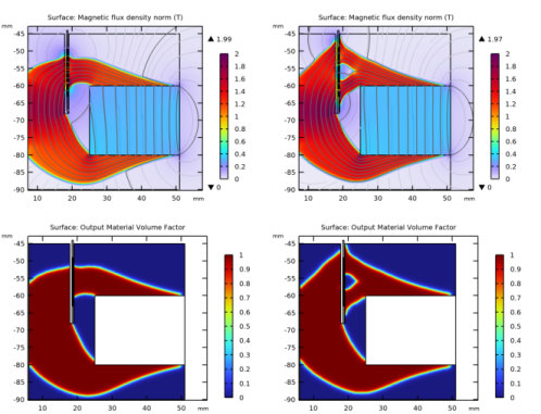هنجار چگالی شار مغناطیسی و ضریب حجم ماده خروجی برای دو مطالعه بهینه سازی در شکل 2 نشان داده شده است . ستون سمت چپ نتایجی را نشان می دهد که فاکتور BL را در موقعیت استراحت به حداکثر می رساند. و ستون سمت راست نتایجی را نشان می دهد که منحنی BL ( x ) مسطح را ایجاد می کند. شکل نشان می دهد که هر دو تنظیمات بهینه سازی منجر به طرح هایی می شود که از دو بخش مجزا تشکیل شده است. یک جزء مرکزی متصل به پایین آهنربا، که معمولاً یوغ یا قطبی نامیده می شود، و یک قسمت جدا شده متصل به بالای آهنربا، که معمولاً صفحه بالایی یا صفحه جلو نامیده می شود.