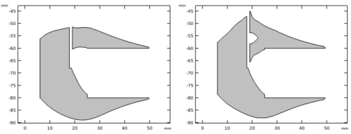 مطالعه بهینه سازی توپولوژی یک نقشه چگالی تولید می کند که بین بازه [0،1] تغییر می کند. در حالت ایده آل با تمام عناصر موجود در فضای طراحی باید به حداقل یا حداکثر چگالی در محدوده برود. مجموعه داده فیلتر ، این نقشه چگالی را با حذف عناصر (یا قسمتهایی از عناصر) با چگالی زیر یک آستانه خاص، به یک هندسه تبدیل میکند. با انتخاب مقدار چگالی میانی 0.5، می توان هندسه ای به دست آورد که بتوان از آن برای اعتبار سنجی رابطه BH مورد استفاده در مرحله بهینه سازی توپولوژی استفاده کرد. شکل 3 هندسه حاصل از اعمال مجموعه داده فیلتر را در دو مطالعه بهینه سازی نشان می دهد.