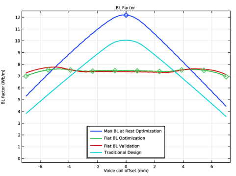 به عنوان خلاصه، شکل 4 منحنی BL ( x ) مدل های مختلف را نشان می دهد . محور افقی نشان دهنده افست سیم پیچ صدا x (جابجایی محوری سیم پیچ صدا) و محور عمودی نشان دهنده ضریب BL است . این شکل همچنین شامل منحنی BL از یک طراحی سنتی است که از مدل Loudspeaker Driver — Frequency-Domain Analysis گرفته شده است .