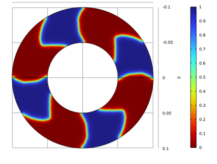 این مدل نشان میدهد که چهار شیار توپولوژی بهینه است، اما اجرای بهینهسازی با مش ظریفتر و شیب طرحریزی بالاتر میتواند توپولوژیهای مختلف را با عملکرد قابلتوجهی بهتر ارائه دهد ( N=1، بتا=8، meshsz=1[mm] یک مثال است. ). این طرح از نظر کیفی با طرح چهار شیار یکسان است، اما نسبت طول و عرض شیارها به طور قابل توجهی بیشتر از آنچه در طرح های بلبرینگ معمولی دیده می شود، است.
