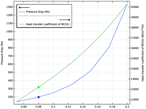 نتیجه مطالعه بهینه سازی با نتایج مطالعه پارامتری در مدل اصلی مطابقت دارد. بهترین عملکرد در مقایسه با یک MCHS استاندارد بدون هیچ لایه متخلخل برای ضخامت لایه متخلخل 0.1 میلی  متر است. برای مقایسه نتایج مطالعه بهینه سازی با مطالعه پارامتری انجام شده در مدل عملکرد یک سینک حرارتی میکروکانالی متخلخل ، نتایج برای میانگین افت فشار، میانگین ضریب انتقال حرارت و اعداد رینولدز و ناسلت بدون بعد به عنوان نقاط اضافی رسم شده است. در نمودارهای جدول موجود. نقاط اضافی با یک ستاره مشخص می شوند. شکل 1نشان می دهد که مقادیر افت فشار و ضریب انتقال حرارت به خوبی روی منحنی قرار دارند که هر دو را به عنوان تابعی از ضخامت لایه متخلخل نشان می دهد.