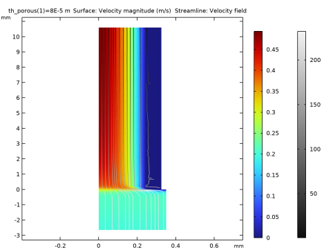 شکل 4 میدان سرعت را در مقطعی از کانال نشان می دهد. بزرگی سرعت در داخل ساختار متخلخل در مقایسه با کانال جریان آزاد کوچک (آبی تیره) است. فشار در امتداد خطوط جریان در مقیاس خاکستری ترسیم شده است. این شکل را با شکل مربوطه در مدل اصلی عملکرد سینک حرارتی میکروکانالی متخلخل مقایسه کنید .