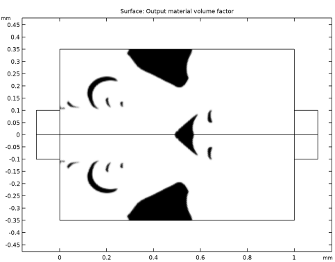فیزیک این مدل با فیزیک بهینه سازی ریزشیر تسلا یکسان است ، بنابراین تفاوت اصلی در تنظیم هندسه پارامتر شده است. نتیجه بهینه سازی توپولوژی در شکل 1 نشان داده شده است ، در حالی که هندسه اولیه برای این مدل در شکل 2 نشان داده شده است .