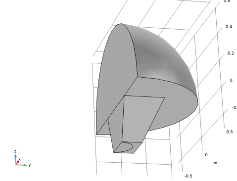 شکل 1: هندسه اولیه از یک کره در خارج از شاخ تشکیل شده است. شاخ در یک بافل بی نهایت قرار گرفته و به شکل یک هرم است. یک دایره در پایین بوق برای بلندگوی ایدهآل درایور بلندگو استفاده میشود.
