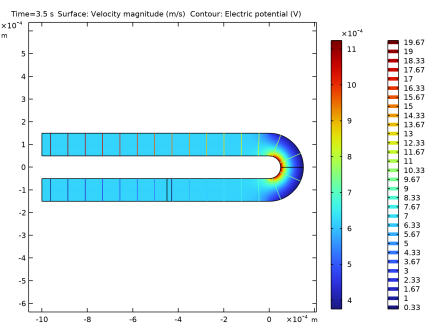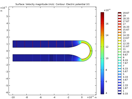بزرگی میدان سرعت (نمودار سطحی) و پتانسیل الکتریکی (محورها) برای هندسه اصلی در شکل 2 رسم شده است . خطوط هم پتانسیل در امتداد منحنی داخلی نزدیک‌تر هستند که منجر به یک میدان الکتریکی غیریکنواخت و میدان سرعت در بخش منحنی می‌شود. نوار املاح لبه داخلی را با سرعت بیشتری طی می کند و در نتیجه پراکندگی قابل توجهی وجود دارد ( شکل 3 را ببینید ).