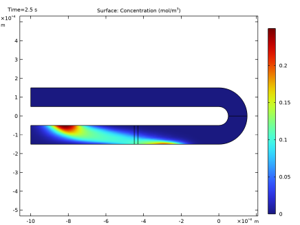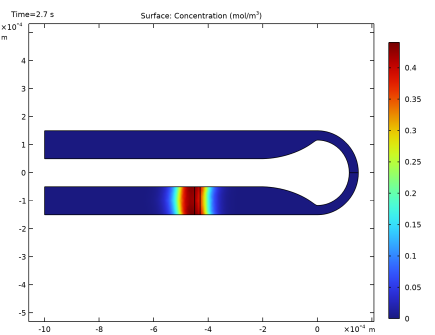 انتقال املاح از طریق کانال منحنی با استفاده از معادله همرفت- انتشار گذرا مدل‌سازی می‌شود. انتشار، D ، گونه به عنوان 1·10-11 m2  / s در نظر گرفته می شود، که بر اساس سرعت لغزش و عرض، W ، کانال (Pe = eo W) به عدد Peclet تقریباً 6100 منجر می شود /D ).