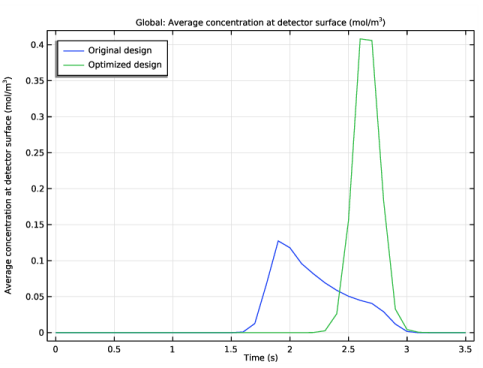 شکل 6 میانگین غلظت عبوری از آشکارساز (دامنه 3) را برای هندسه اصلی و همچنین بهینه شده مقایسه می کند. اوج شدت غلظت متوسط ​​به دست آمده تقریباً سه برابر بیشتر برای هندسه بهینه شده در مقایسه با هندسه اصلی برای عدد Peclet داده شده است.