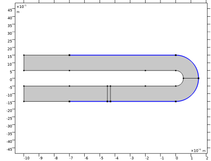 هندسه اصلی دستگاه در شکل 1 نشان داده شده است . عرض کانال 100  میکرومتر و شعاع بیرونی o برای کانال منحنی 150  میکرومتر است . طول L برای بخش مستقیم میکروکانال 1 میلی متر است. باند گونه های شیمیایی در  = – 600μm  معرفی شده و به عنوان پالس گاوسی با غلظت اوج 1 mol/m3 مدل سازی شده است .