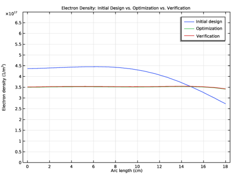 شکل 1 و شکل 2 چگالی الکترون و شار یون را در امتداد جهت شعاعی نشان می دهد. راه حل بهینه شده به وضوح در جهت شعاعی یکنواخت تر است.
